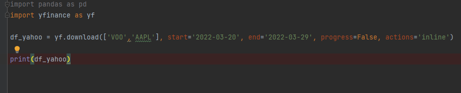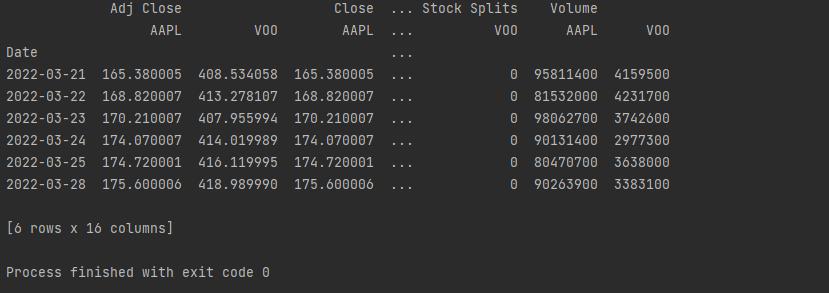 간단하게 VOO(Vanguard 500 Index Fund ETF) 와 APPLE의 2022년 3월 20일과 3월 29일 사이의 데이타를 배당이나 액면분할정보(actions='inline') 와 함께 받았다. Progress = True 할 경우에는 데이터 다운로드 하는 %가 표시되지만 워낙 순식간에 주르륵.....