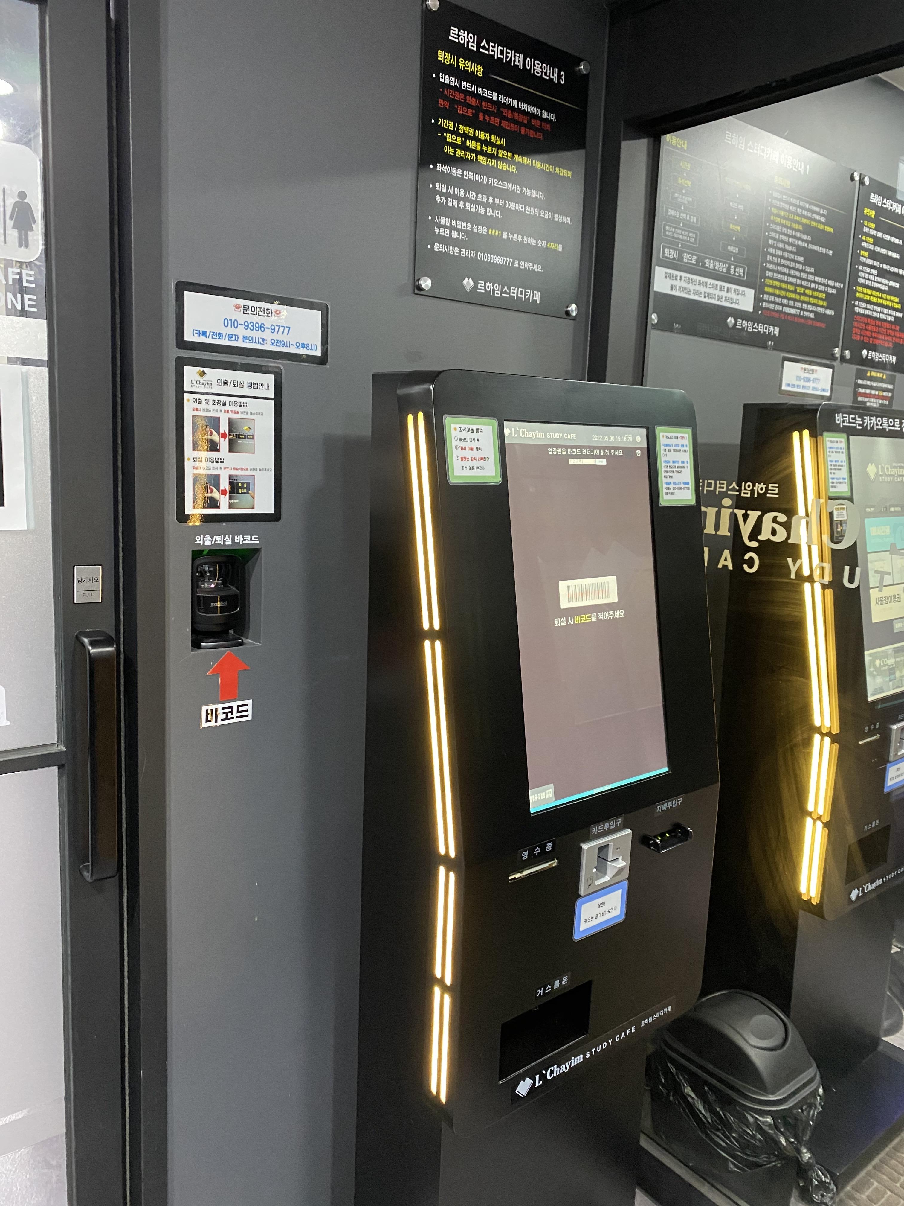 위와 같이 매장 이용 관련 안내 키오스크가 있고 옆에는 바코드가 있습니다. 이용하려고 할 경우 바코드를 찍거나 키오스크로 결제를 하면 키오스크에서 해당 좌석을 선택하도록 스터디 카페 내부 모식도?가 나옵니다. 좌석을 선택하면 해당 좌석에 전원이 들어오면서 이용 가능한 상태가 됩니다.